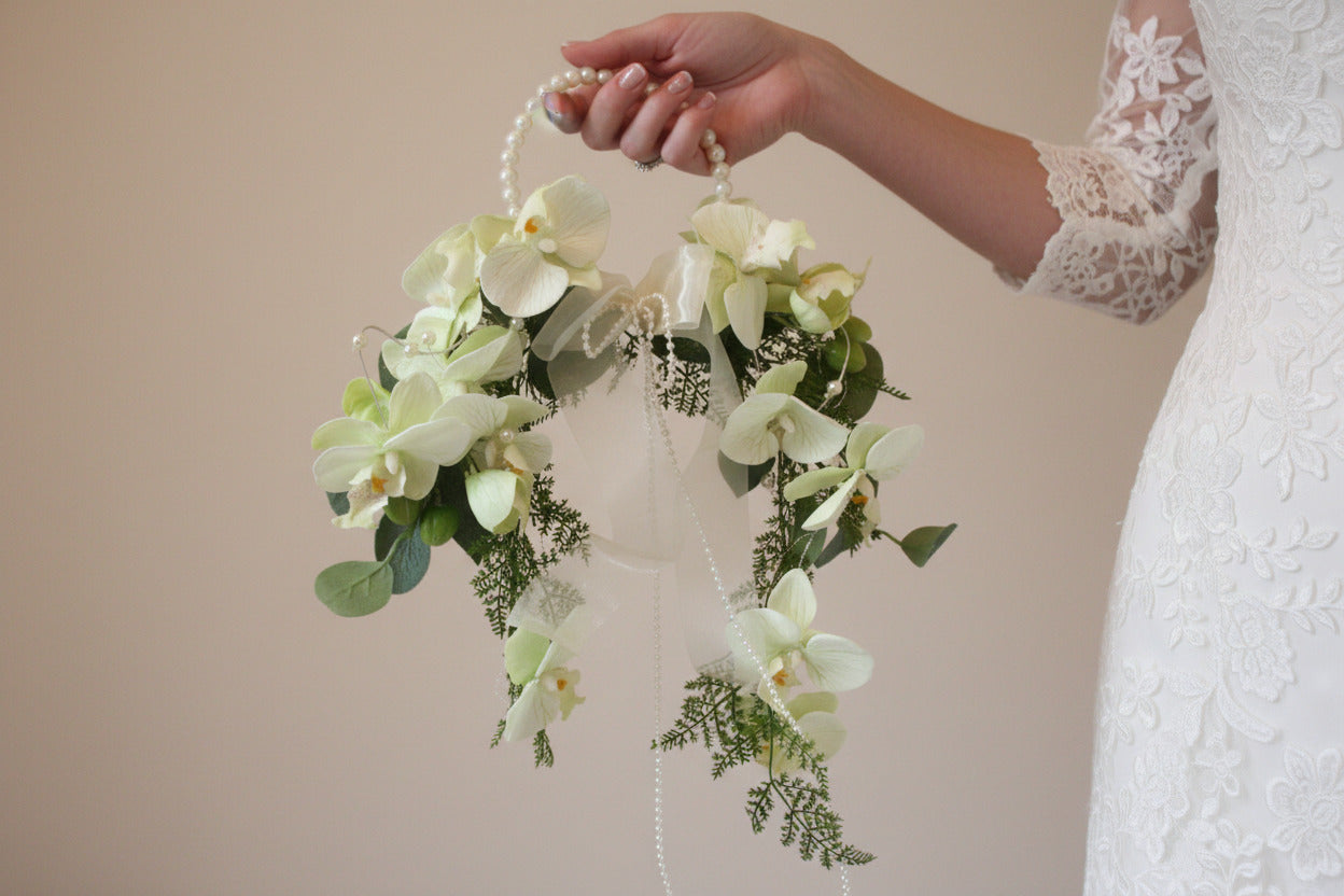Elegant bridal bouquet of orchids with many pearls, ideal for the delicate bride, the color of the orchids is a delicate light green, also available in white.
