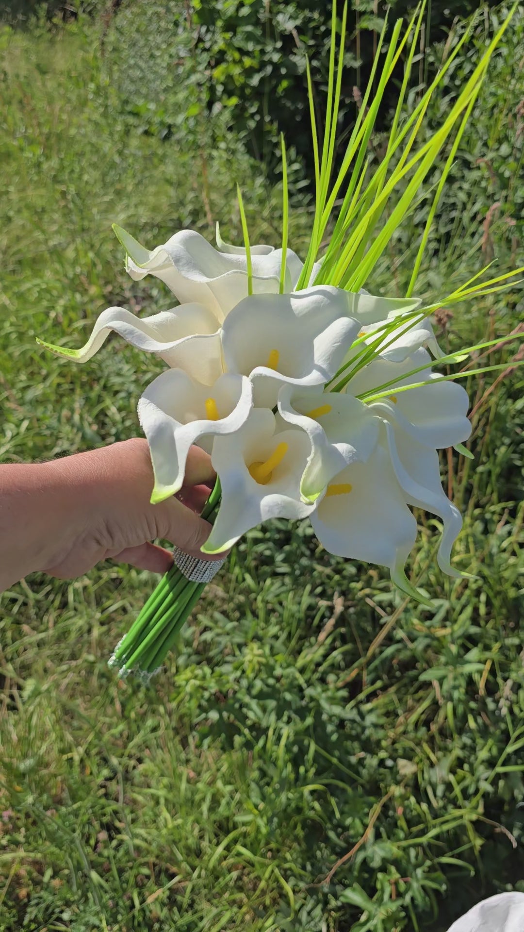 Callabrautstrauss modern gebunden mit Strassdeko , Handstrauss für die moderne Hochzeit , passender Anstecker und weitere passende Artikel einfach unter Annabel