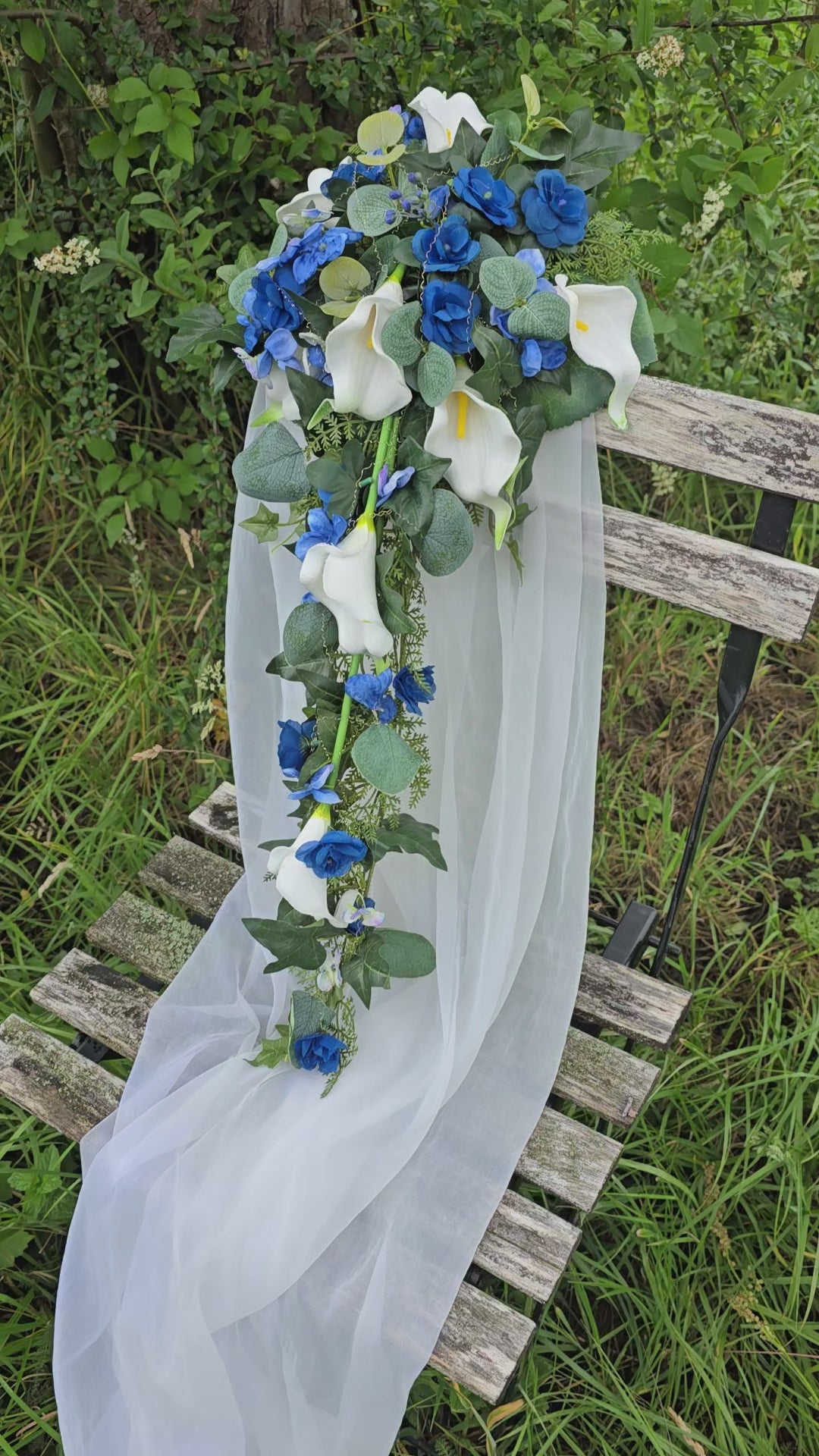 Edler Callawasserfall mit kleinen blauen Akzenten , ideal für Kirche, L„nge ca. 65 cm, Brautstrauss mit zarten Röschen / Blüten und