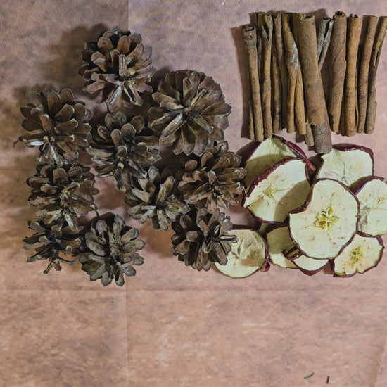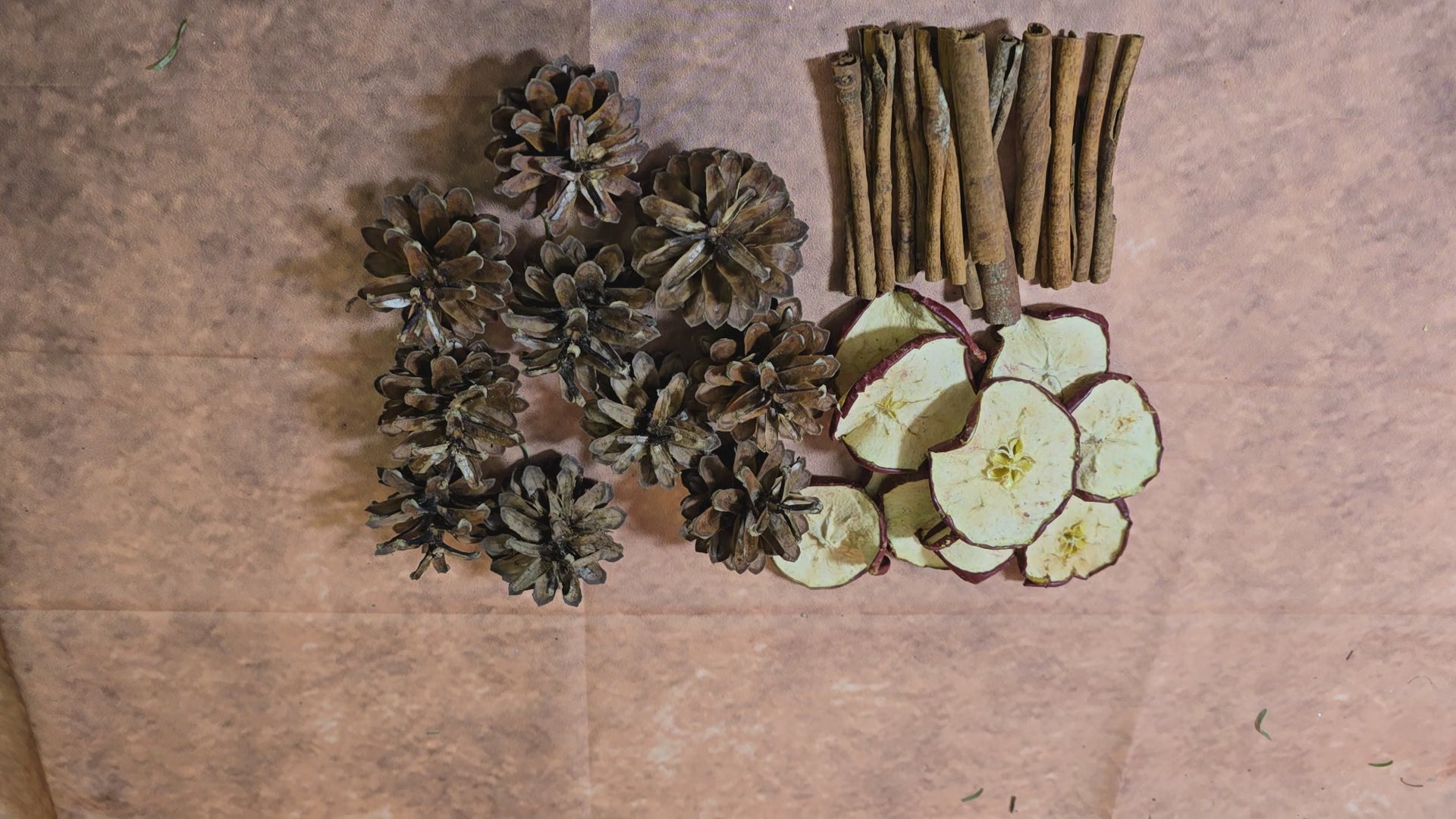 Dieser Pack besteht aus kleinen Zapfen, Zimt, Äpfeln und passender Deko (z.B. Sterne)