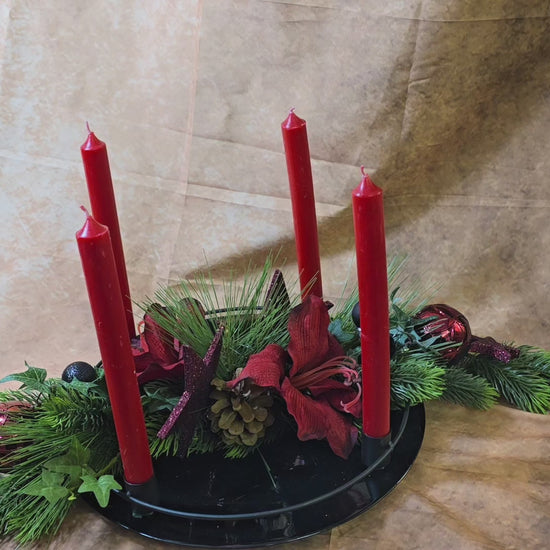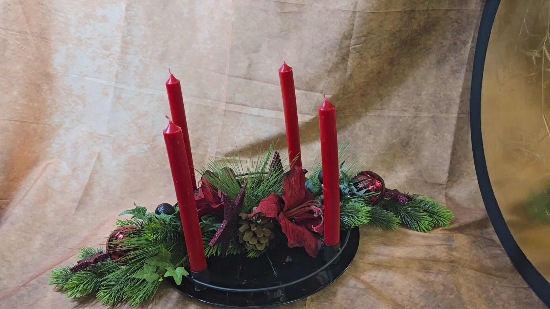 Schwarzer Teller ca 30cm mit Kunsttanne, Zimt und Zapfen, ideal als Geschenk oder für die moderne Adventsdeko. Inclusive der Kerzen