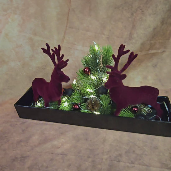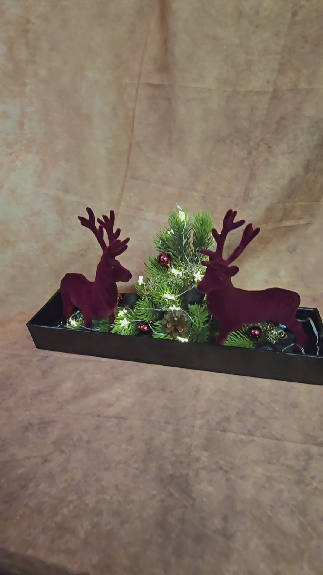 Schwarzer Teller ca 30cm mit Kunsttanne, Hirschen und Kugeln, ideal als Geschenk oder für die moderne Adventsdeko. Inclusive der Lichterkette