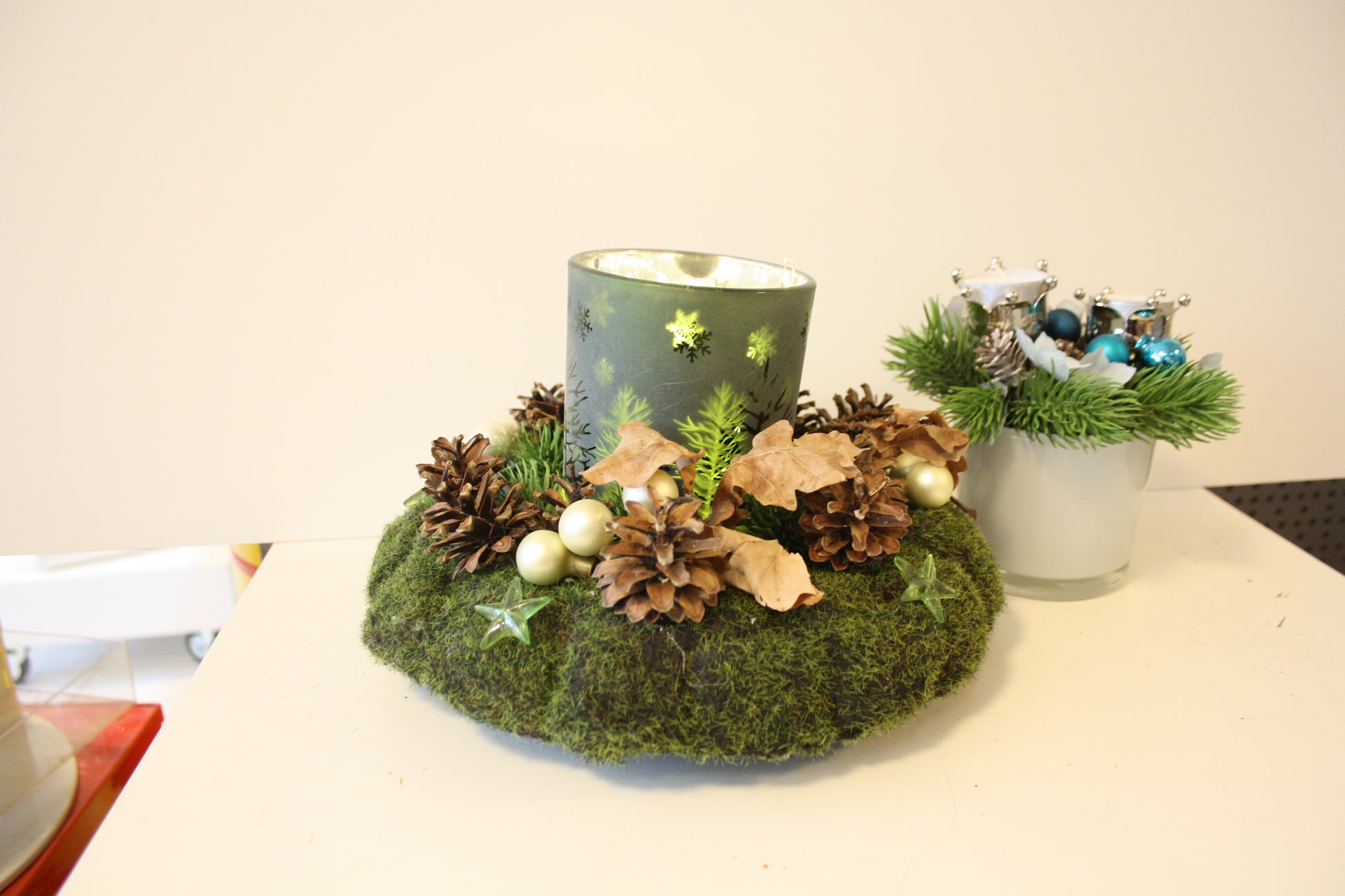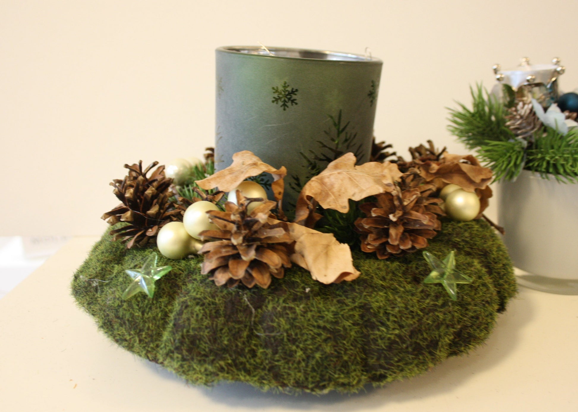 Windlicht in grün im Mooskranz dekoriert, Einzelsück aus unserer Deko