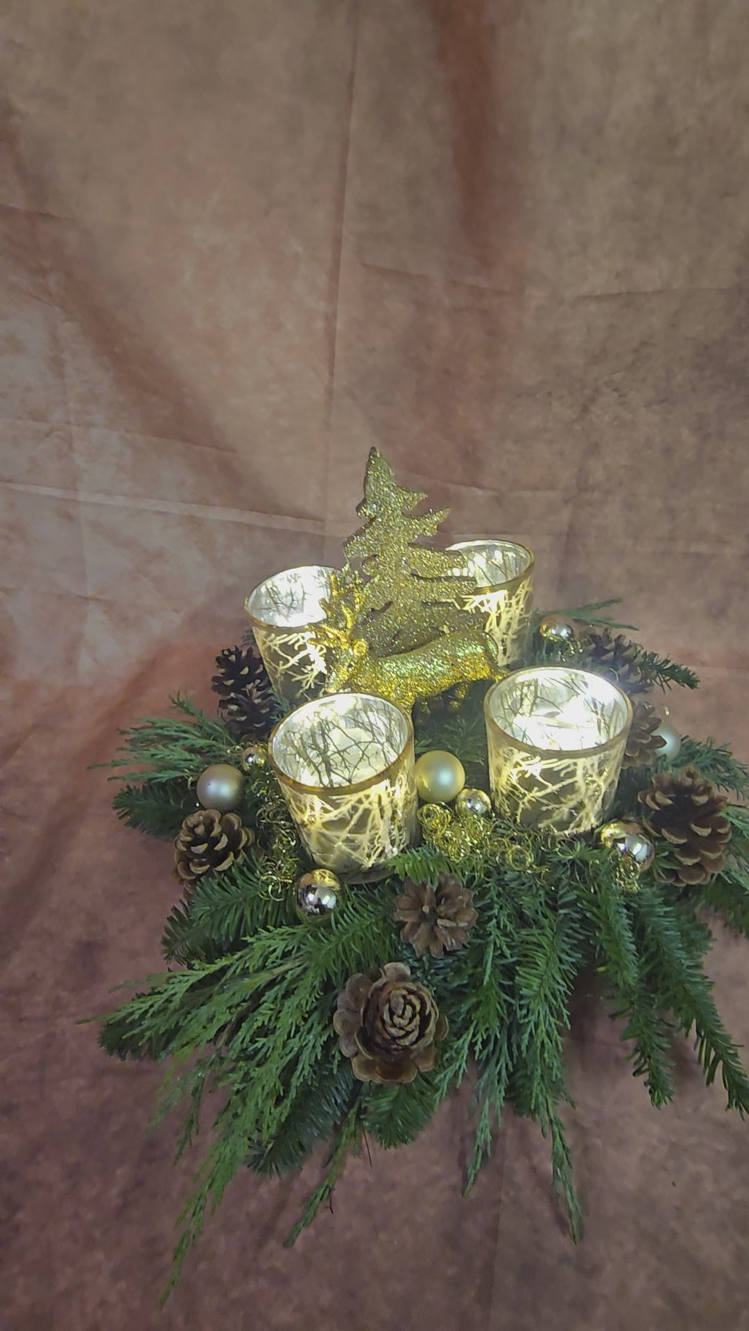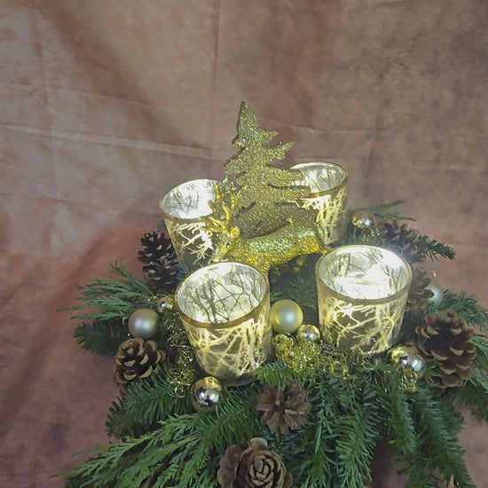 In der Mitte werden große goldene Akzente ( Tanne oder Hirsche) gesetzt. Für Teelichter und natürlich Lichterketten geeignet