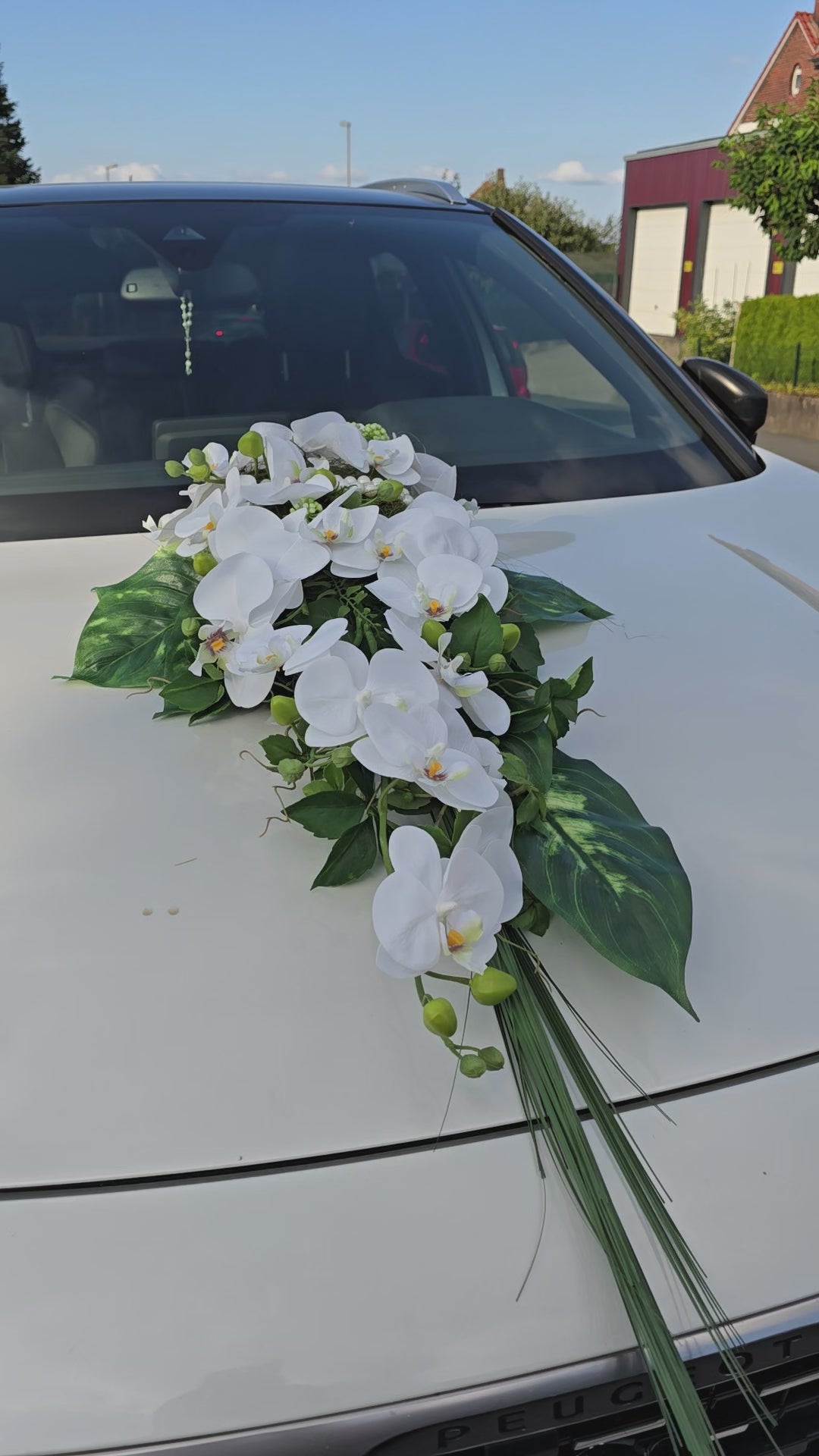 Orchideen Autogesteck für die Hochzeit elegante Autodeko mit Orchideen und vielen Perlen. Wir verarbeiten hier sehr edle Orchideen ( Phalenopsis) in cremeweiß mit vielen Perlen.